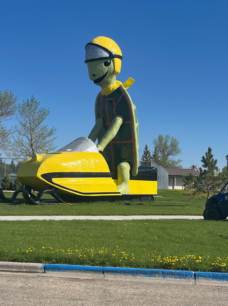 In May of 2024, I flew to Montana to hang out with Walt for a week. We took a road trip to North Dakota to see some of his friends and check in on the little antique engine. We drove to Dick’s farm located 5 miles from Canada. On the way, we had to stop by the world’s largest turtle riding a snowmobile.