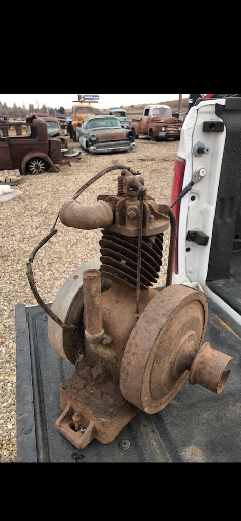 March 2022: The snow drifts were starting to melt and the cars in the field were appearing again. I was beginning to get out and make plans for which cars would be next to come into the shop. So, I drove out into the field looking through different cars and trucks to see if there were any treasures I had missed when I brought them in, when I opened the trunk to that old Plymouth from last year. I was quickly reminded of my loss, but to my surprise there was still some good scrap tucked up along each side of the trunk. What the heck I thought, and I reached in and started pulling some out and carrying it over to my truck. Then when I was almost finished, I pulled out this old one-cylinder engine. It was completely covered in oil and dirt and really didn’t look like much. I thought what the heck, if nothing else, I’m going to clean this up and take it home to decorate my living room. (My whole house was already full of car art anyway)